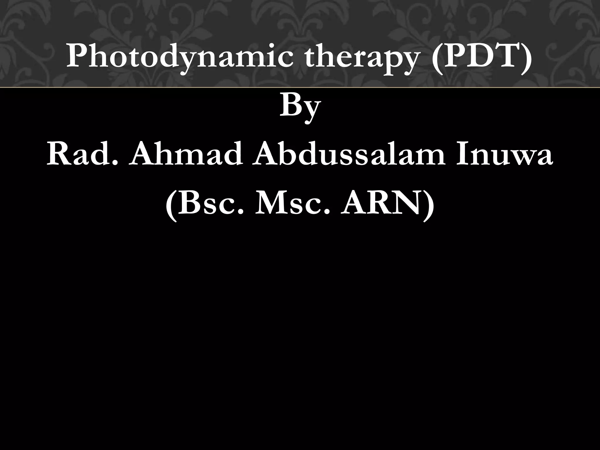 Photodynamic therapy (PDT) involves using a photosensitizing drug and a light source to damage cancer or abnormal tissues. The photosensitizing drug is administered and absorbed by tissues, then activated by exposure to a specific wavelength of light, which causes the drug to produce reactive oxygen species that destroy the targeted cells. PDT can be used to treat a variety of cancers and pre-cancerous conditions depending on the photosensitizing drug and light source used. It offers advantages such as precision targeting and minimal scarring or invasiveness compared to other treatments.