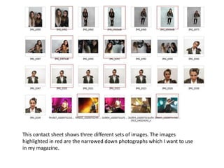This document contains contact sheets from photo shoots with three sets of highlighted images. The first set in red are the narrowed down photos to use in a magazine. The second set compares two front cover photo options, with one having more detail throughout. The third set shows musicians playing instruments to capture the indie genre for the music magazine. A style sheet analysis led to selecting two images with strong light contrast in backgrounds similar to research examples.