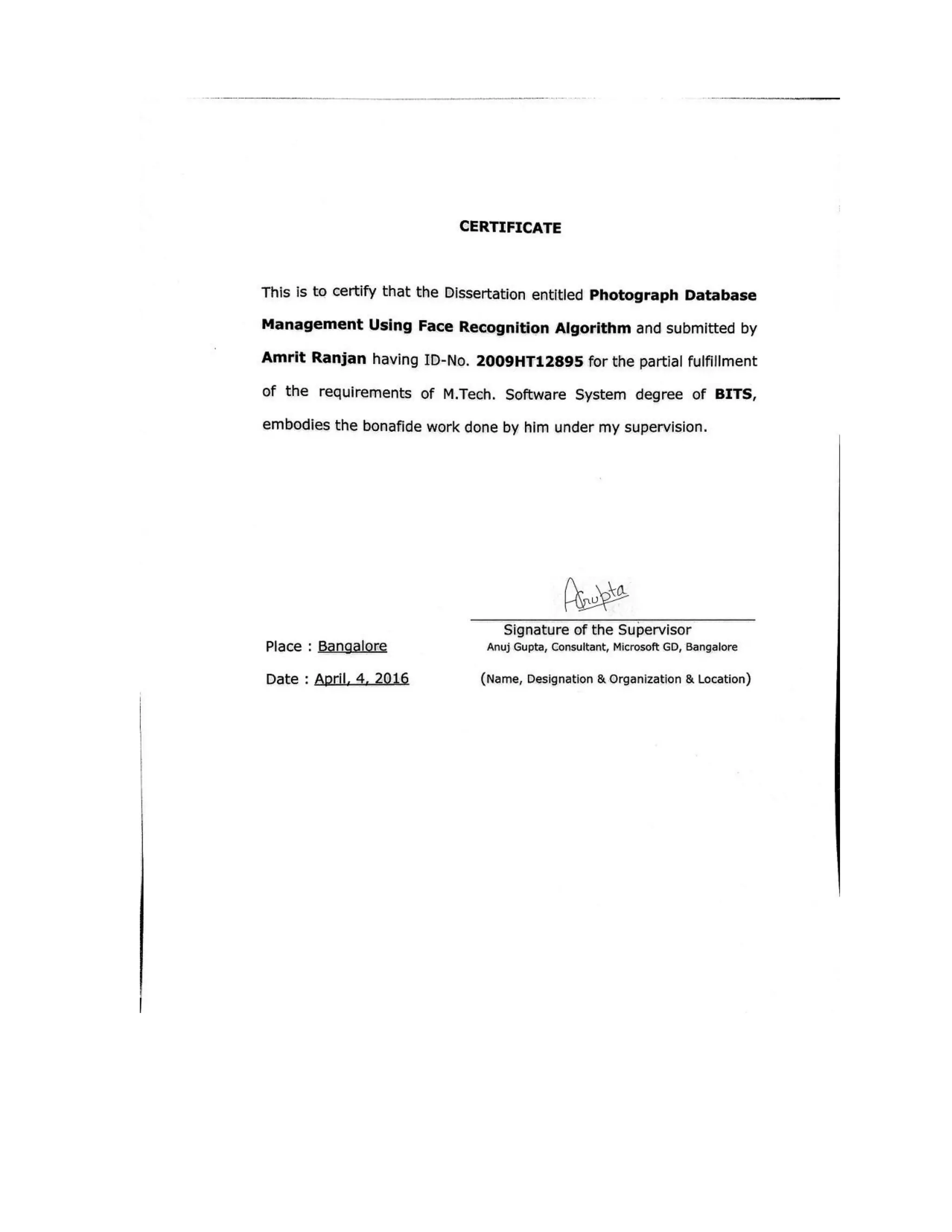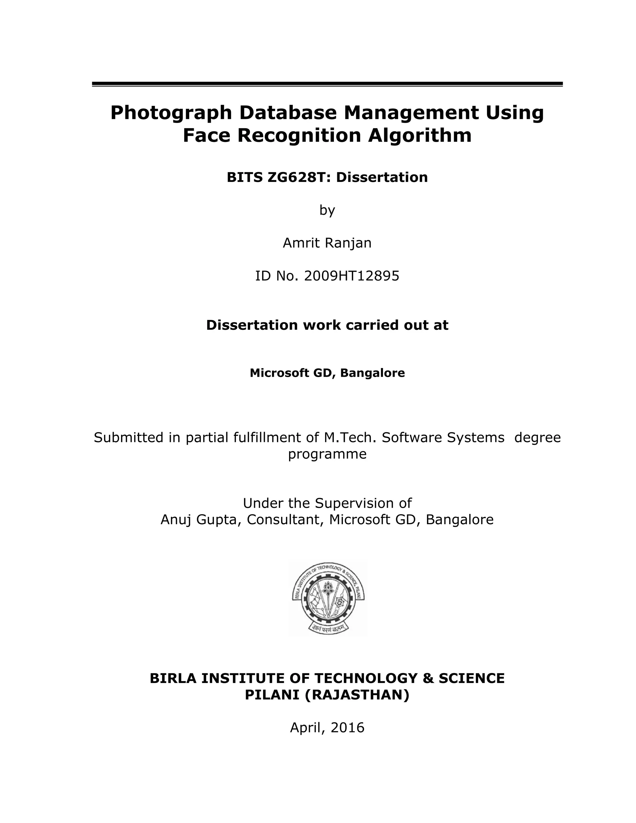 This dissertation by Amrit Ranjan presents a face recognition method for managing photograph databases, utilizing principal component analysis (PCA) to extract and classify facial features for efficient image searching and identification. The proposed system addresses limitations of existing facial recognition systems, enhancing recognition accuracy and allowing for feature-based searches to accommodate variations in facial images. Through neural network training and eigenface representation, the study showcases the system's potential applications in security and criminal identification.