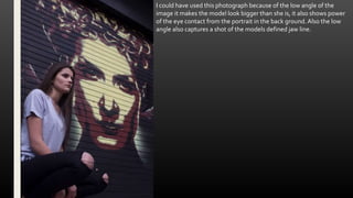 This document discusses and analyzes several potential photographs that could be used for a selection process. The chosen photograph features a model not directly addressing the camera, in contrast to the direct gaze of the portrait in the background, creating visual conflict. The mise-en-scene uses red and yellow colors that suggest anger and conflict. This photograph was selected because it uses the contrasting gazes and symbolic colors to implicitly convey a sense of tension or unease.