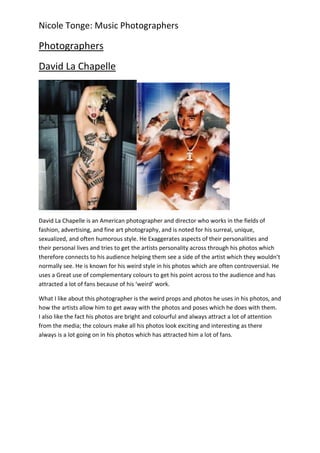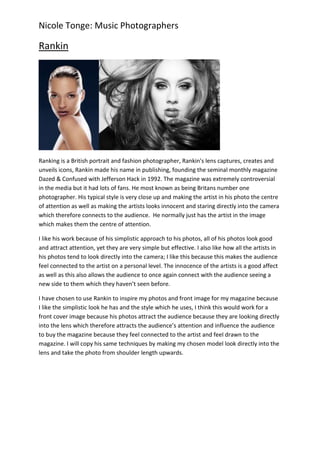 The document discusses two music photographers, David LaChapelle and Rankin. It provides details on their styles, with LaChapelle known for surreal, sexualized photos using unusual props and exaggerated personalities. Rankin takes simple, up-close portraits where the artist stares at the camera, making them the center of attention. The author likes LaChapelle's colorful, attention-grabbing style and Rankin's ability to connect with audiences through direct eye contact and a sense of innocence in the portraits. They plan to emulate Rankin's simplistic technique of shoulder-up close-ups for their magazine cover photo.