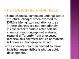 The document discusses the chemical changes in silver halides when exposed to electromagnetic radiation, leading to the photographic effect and the development of latent images into visible images through chemical reactions. It details the structure and properties of silver halides, the process of photographic development, and various theories explaining the formation of latent images. Additionally, it outlines the characteristics of emulsions used in X-ray films, including advantages and disadvantages related to sensitivity and image quality.