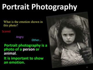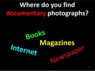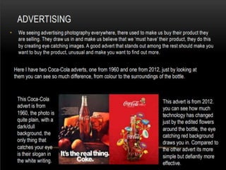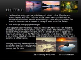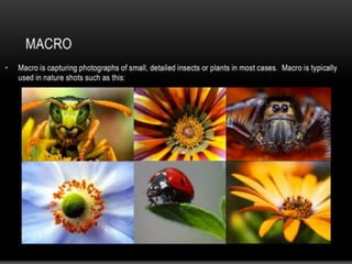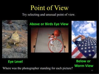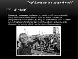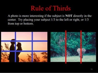 Photography is an art form that allows photographers to capture life in a different way and record stories and events. There are basic guidelines for taking good photographs, such as choosing an interesting location with a simple background, using natural light from early morning or late afternoon, and avoiding backlit subjects. Photographers should take a variety of shots, from wide shots of the surroundings to close-ups of details, to capture the scene from different perspectives.