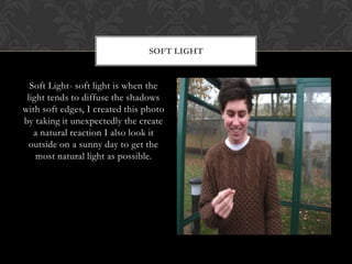 1) Soft light which diffuses shadows with soft edges versus hard light which shows sharp shadows and edges.