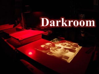 Photography is the process of recording light or electromagnetic radiation to create images. A camera typically uses a lens to focus light onto light-sensitive film or an electronic sensor. On film, an invisible latent image is created that is later developed into a visible image. There are two main types of photography - positive, where the image colors match the scene, and negative, where the darkest areas appear lightest. A darkroom is a room made dark for processing photographic materials, like film and paper. It contains equipment like enlargers to project negatives onto photo paper to create prints.