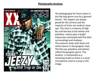 The document summarizes common photography themes and styles seen on front covers and contents pages of hip hop magazines. Front covers typically feature medium close-up shots of rappers posing in gangster style with black and white costumes. Contents pages usually show more revealing shots of female models in varied poses across the majority of their bodies, with the photography using a mix of high and low key lighting to draw attention to the models and text. Sketches provide examples of common shot compositions and placements of images, text and design elements.