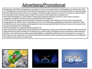 Photography can be used for many applications such as advertising, fashion, photojournalism, and portraiture. Advertising photography aims to sell products by featuring them in attractive images. Fashion photography promotes clothing brands by showing their items on models. Photojournalism documents real-life events and issues through images to tell stories. Portraiture captures facial expressions and details to characterize individuals. Across applications, photography may involve controlled studio shoots or candid outdoor photos, with variations in lighting, lenses, and minor post-production editing.