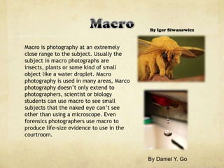 Macro photography involves taking extremely close-up photos of small subjects like insects or plant details that cannot be seen clearly with the naked eye. It is used in fields like science, forensics, and biology to study small subjects. Macro photography requires a shallow depth of field to focus clearly on the close subject while blurring the background, helping the subject stand out.