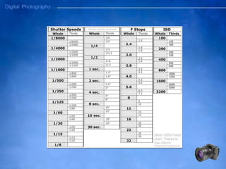 2) It discusses the exposure triangle which includes aperture, shutter speed, and ISO - the three elements that determine the exposure of a digital image.