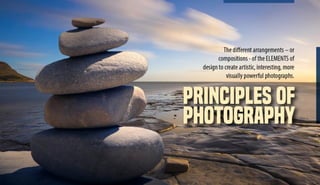 The document discusses the key elements and principles of photography. It outlines the elements of line, shape/form, space, value, texture, and color. It then explains the principles of emphasis, balance, unity, contrast, movement/rhythm, and pattern/repetition. The document was created by instructor M. Mujeeb Riaz and provides definitions and examples of each element and principle to educate photographers on how to apply these concepts in taking photographs.