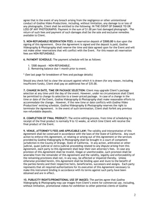 This contract outlines the terms of photography services between Godina Videography & Photography and their clients. Key terms include Godina being the exclusive photographer, payment terms requiring a $500 non-refundable deposit, and policies around changes, cancellations, and completion of final products. The contract details responsibilities of both parties and covers issues such as illness, weather, legal matters, and use of photos for promotional purposes. Clients must initial their package selection and sign agreeing to the terms.