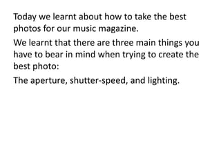 The document summarizes a photography lesson that taught about aperture, shutter speed, and lighting. It discusses how aperture controls the amount of light let into the lens, with lower settings producing darker photos. Students practiced with plastic toys to focus on small objects. Shutter speed determines the length of time the shutter is open, with higher speeds freezing motion and lower allowing blur. Practicing involved throwing balls and running. Lighting, or ISO, controls the camera's sensitivity to light. Students took photos of each other in a studio using reflectors and lightboxes in different positions.