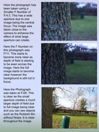 The document discusses various settings that control the aperture, shutter speed, ISO, white balance, and other factors that determine the exposure and quality of a photograph. Aperture controls depth of field, with smaller numbers resulting in a shallower depth of field. Shutter speed controls motion blur, with faster speeds freezing motion. ISO makes the sensor more or less sensitive to light. Various tools can then be used in post-processing to adjust levels, curves, colors and exposure locally.