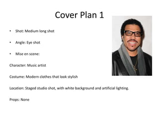 Edward Gough has outlined several photography plans for a music project including two cover shot plans, two contents shot plans, and three DPS (digital press kit) shot plans. The cover shots would feature either a solo musician or band on a stage. The contents shots focus on DJ equipment or musicians in a studio. The DPS shots include a musician playing an instrument, someone using DJ software on a computer, and a close-up of headphones against a white background.