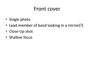This document provides photography planning suggestions for a magazine spread about a band. It recommends a close-up shot of the lead singer looking in a mirror for the front cover. For the contents page, it suggests using 2-3 medium shots of band members standing neutrally together against a white background, as well as action shots from other articles. For the double-page spread, a low-angle stairwell shot is proposed showing band members posing neutrally to leave space for additional text.