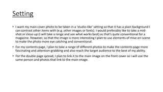 The document outlines plans for photography for a music magazine, including settings, props, costumes, shot types, and composition. The cover photo will be taken with a plain background to contrast other elements. Photos for the contents page will make it more interesting, using various costumes and genres. The double page spread will link to the cover photo using the same person. Props may be used but the cover will focus on the story. A variety of shots, costumes, makeup and genres will be used to portray the magazine's style and stories.