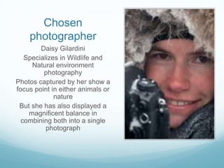 Daisy Gilardini is a wildlife and nature photographer from Switzerland who specializes in capturing animals and natural environments. She has a style of focusing on either animals or nature itself, but is also able to beautifully balance both elements in a single photo. Her work demonstrates extensive research of natural environments and brings photography of nature to a new level of showcasing its beauty. Her photos promote environmental preservation and have been featured in National Geographic and BBC Wildlife.