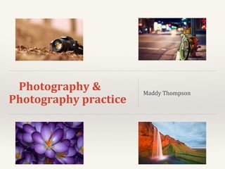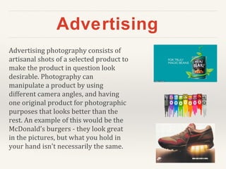 Photography can be used for advertising, landscape, fashion, and macro purposes. Advertising photography aims to make products look desirable through camera angles and lighting. We see ads in magazines, TV, and online. Landscape photography captures nature and settings. It is seen in nature books and magazines. Fashion photography displays clothing in ads and magazines like Vogue. Past fashion photographers included Richard Avedon and present ones include Mario Testino. Macro photography captures small subjects and is seen in magazines, books, and social media. It requires specialized lenses or equipment. Past macro photographers included Edward Weston and present ones include Heather Angel. For each genre, the summary discusses example photographers, where the photos are seen, and tips for taking