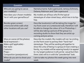 Kyle plans to photograph four male models - Kyle, Ramouy, Delaney, and Tyler - for a hip-hop photography project due on March 20th. The models fit the stereotype of urban street boys, which aligns with his hip-hop genre. He will take photos against an untextured white wall to allow editing in Photoshop, as well as at a recording studio to portray the models as up-and-coming artists. The cover photo will depict the models standing together without smiling to portray a "hard man" image, wearing hoodies to appeal to his target audience.
