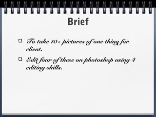 - The document discusses a photography project to take 10+ pictures of Menorca, Spain to be edited and submitted for a travel or tourist guide.