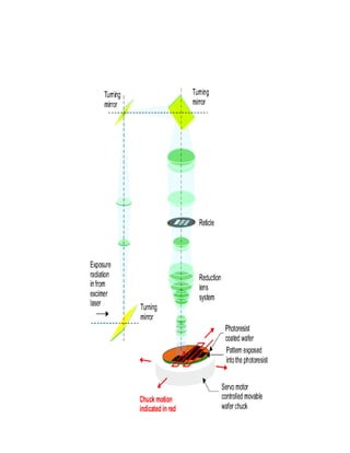 Photolithography is a process for transferring geometric patterns onto a substrate using light. It involves coating a photoresist layer on the substrate, exposing it to light through a photomask, and developing it to selectively remove either the exposed or unexposed areas. The key steps are photoresist coating, soft baking, alignment and exposure, development, hard baking, etching, and photoresist removal. Positive photoresist becomes soluble after exposure while negative photoresist becomes insoluble, allowing selective removal of one area versus the other during development.