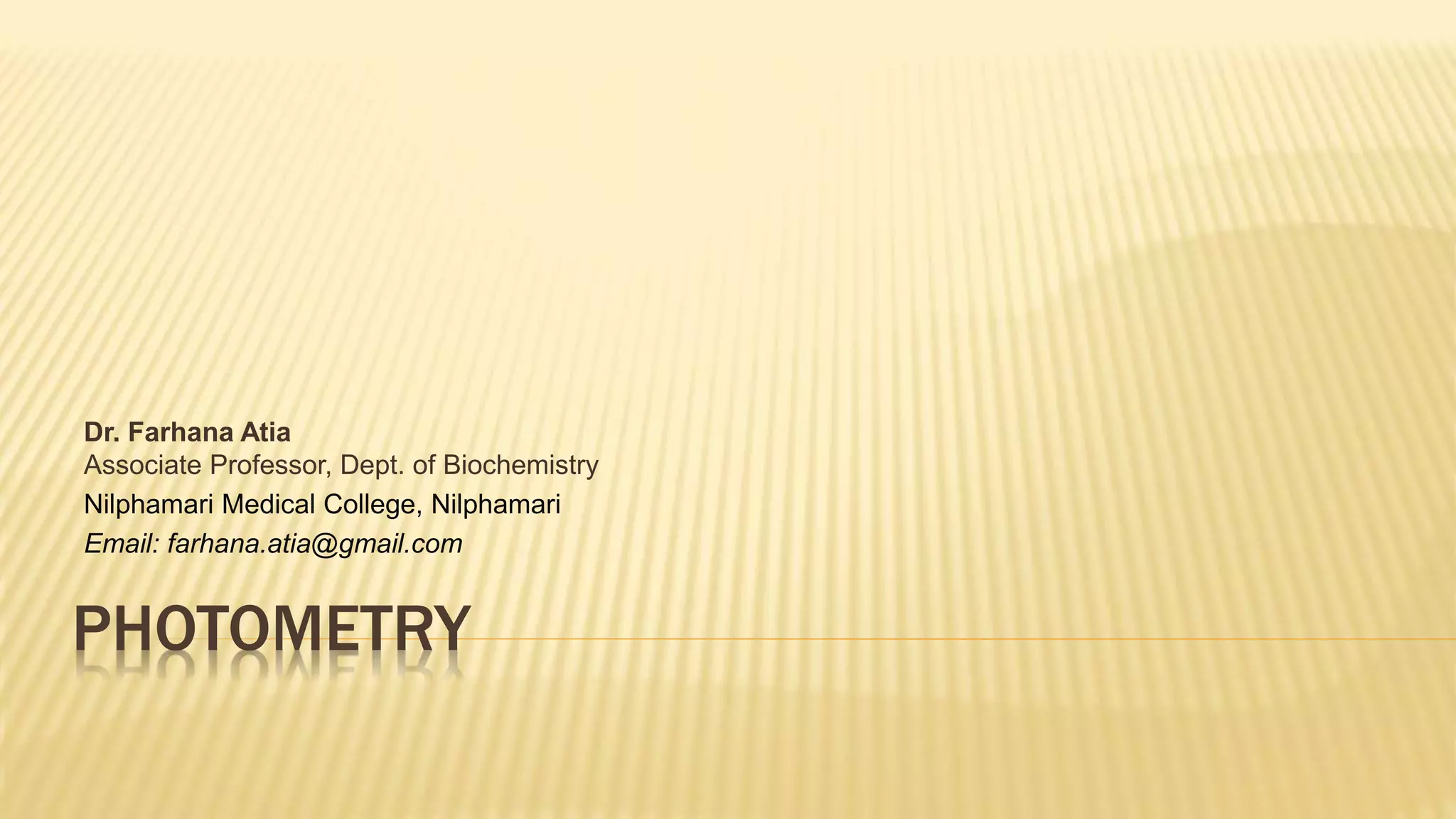 Photometry broadly deals with the study of light absorption by molecules in solution. It is one of the most common analytical techniques used in clinical biochemistry laboratories to measure the intensity of a light beam. Most clinical chemistry reactions involve linking a chemical or enzymatic reaction to the development of a colored product, the intensity of which is then measured photometrically. The amount of light transmitted through a colored solution decreases exponentially with increases in the concentration and thickness of the colored substance, as governed by Beer's and Lambert's laws. Common photometers include colorimeters, which measure visible light, and spectrophotometers, which can measure ultraviolet and visible light.