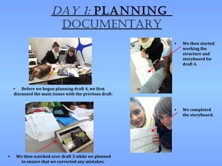 We planned draft 4 of the documentary by discussing issues with the previous draft, watching draft 3 for mistakes, and developing a new storyboard. We also explored inspiration for illustrations. On day 2, we filmed the presenter at various locations using different cameras and shots to get a variety of footage, then checked that we captured all needed material according to the storyboard and script.