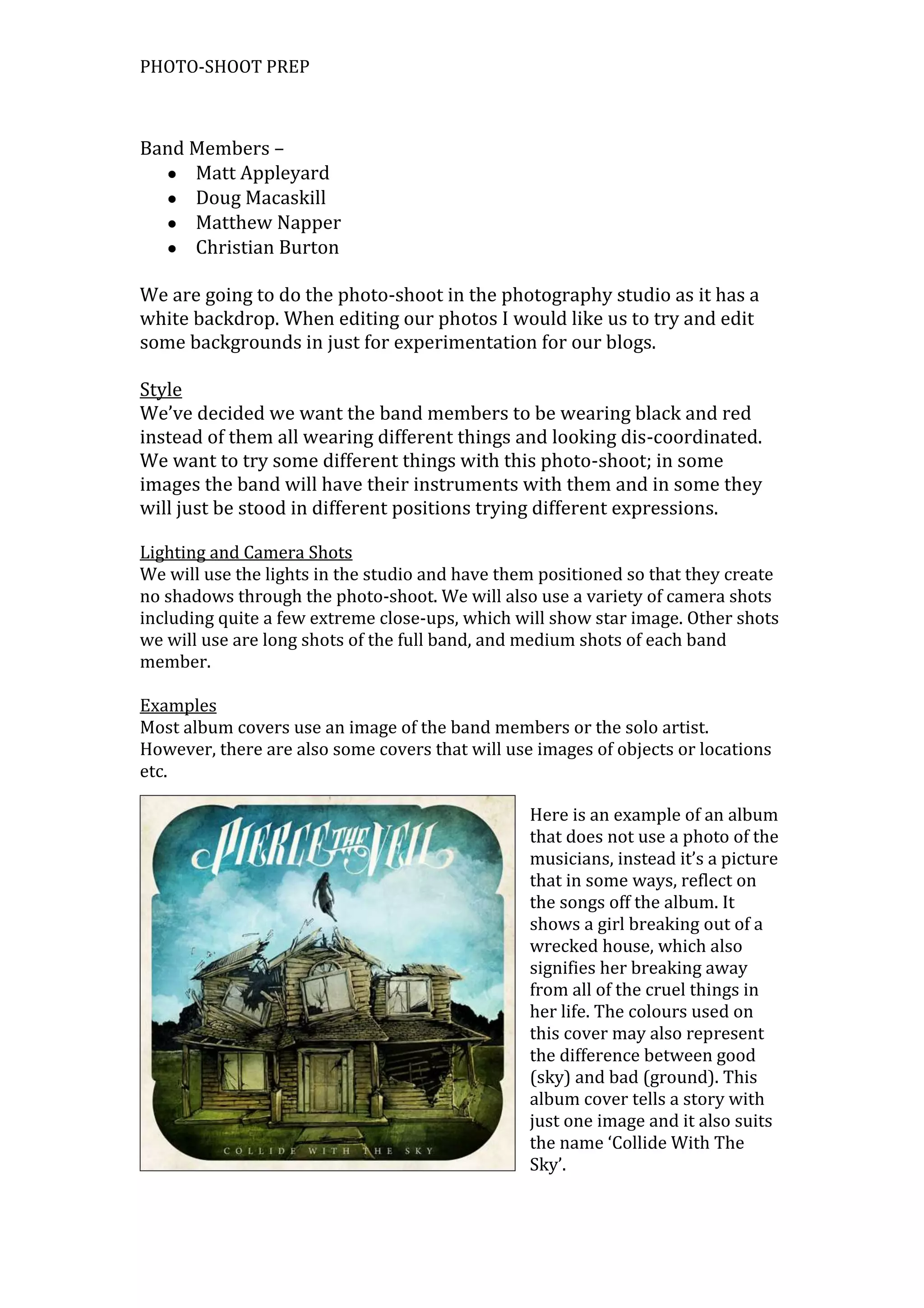 The document provides details for an upcoming band photo shoot. It lists the band members and states that photos will be taken in a photography studio against a white backdrop. It discusses wanting to edit some background images for experimentation on blogs. It notes that the band members will wear black and red instead of different colors to look coordinated. Some photos will include instruments and some will have different poses and expressions. Lighting will avoid shadows and various camera shots like close-ups and long shots will be used. Examples are given of album covers that do and do not feature the musicians, to provide inspiration for the shoot and possible cover designs.