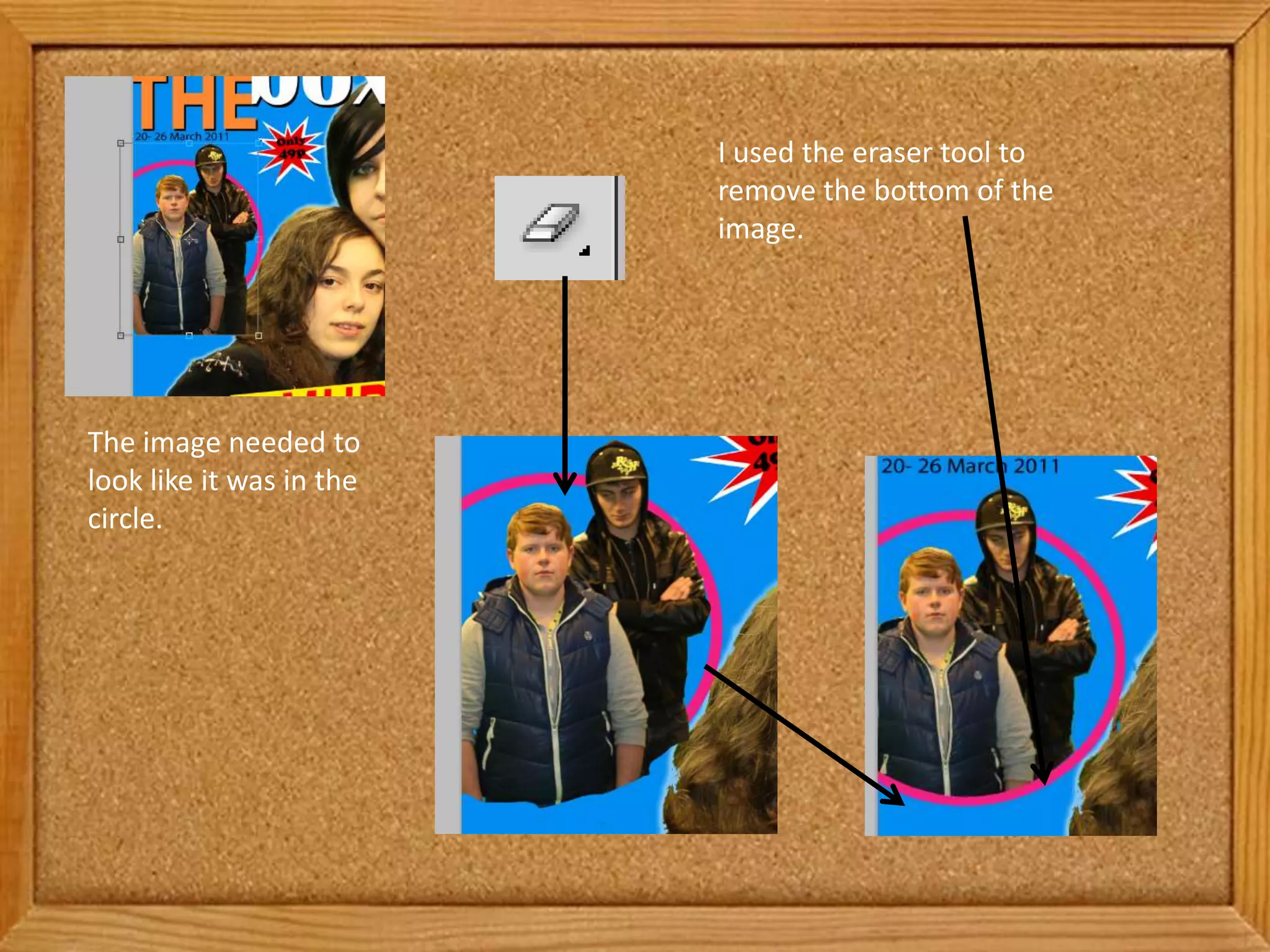 The document describes editing an image in several steps: erasing the bottom to make it fit in a circle, adding an outer glow to text to mimic magazine style, adjusting opacity and spread of the glow, using a gradient fill for the background and adjusting it, pulling characters onto the background, using the eyedropper tool to get a color and painting over text with that color, and adding new text.