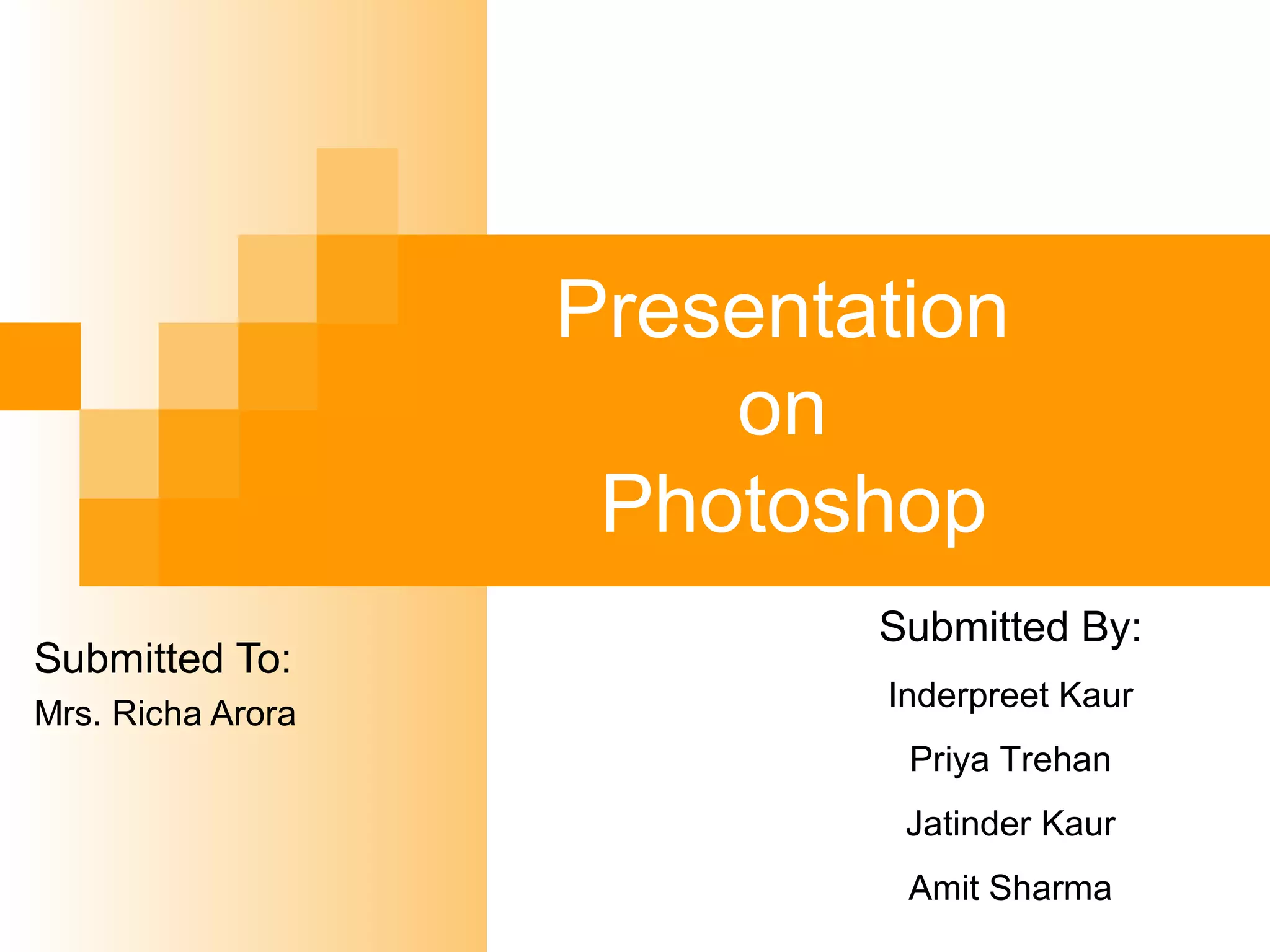 The document is a presentation on Photoshop that discusses its meaning, features, system requirements, and various tools. It provides descriptions and examples of how to use many of Photoshop's selection, editing, and manipulation tools, including the marquee, lasso, crop, magic wand, move, healing brush, eraser, blur, slice, history brush, clone stamp, eyedropper, dodge, burn, and sponge tools. Requirements for running Photoshop include at least a 1GB RAM, 1GB hard disk space, and 1024x768 display.