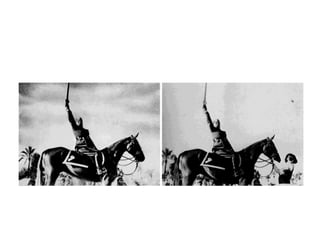 This document provides examples of photos that have been digitally altered or "photoshopped" for various purposes, including propaganda, deception, and aesthetics. Some key examples summarized are a doctored photo that was published against a political opponent in an election, a composite photo of Abraham Lincoln's head on another person's body, and photos of political leaders like Stalin, Mao, and Hitler that were altered in their own propaganda efforts.