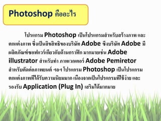 องประกอบของโปรแกรม Photoshop 1. 2. โปรแกรม Photoshop เป็นโปรแกรมสาหรับสร้างภาพ และ