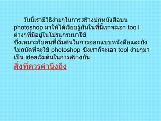 เทคนิคการทำPhotoshop 1. 2. วันนี้เรามีวิธีง่ายๆในการสร้างปกหนังสือบน photoshop มาให้ได้เรียบรู้กันในที่นี้เราจะเอา too l ต่างๆที่มีอยู่ในโปรแกรมมาใช้ ซึ่งเหมาะกับคนที่เริ่มต้นในการออกแบบหนังสือและยังไม่ถนัดที่จะใช้ photoshop ซึ่งเราก็จะเอา tool ง่ายๆมาเป็น idea เริ่มต้นในการสร้างกัน สิ่งที่ควรคำนึงถึง 3. 1 . สีที่ใช้ต้องเป็สสีที่สร้างอารมณ์สอดคล้องกับเนื้อหา 2 . รูปที่อยู่หน้าปกต้องสื่อถึงภาพรวมหรือสดคล้องกับเนื้อหา 3 . การสร้างรูปจาก photoshop นั้นเราต้องรู้ขนาดที่เราต้องการที่แน่นอน เนื่องจาก photoshop น้นเป็นแบบ pixel ถ้าขยายหรือย่อรูปอาจไม่สวย ซึ่งจะ แตกต่างจากการสร้างจาก illustrator นั้นคือเป็นแบบ vector 4 . สิ่งที่ต้องมีบนปกคือ ชื่อหนังสือ ชื่อผู้แต่ง และรูปแบบการ design ในข้อนี้แล้วแต่ idea ของแต่ละคนนะครับ เรามาเริ่มกันเลยดีกว่าครับ 4. 1 . สร้าง file ใหม่ขึ้นมาโดยไปที่ file--->new ผมจะยกตัวอย่างเป็นขนาด 19.5*25 cm นะครับ 5. 2 . เลือก paint bucket tool---> เลือกสี --- > เทสีลงบน background 6. 3 .copy รูปที่เราต้องการเาาไว้หน้าปกมาวางที่ background เราสามารถย่อขยาย หมุน รูปได้โดยวิธีการกด ctrl+t เราก็จะสามารถต่อรูปได้ หมุนรูปได้ ลองเล่นดูนะครับ 7. 8. 5 . เมื่อเราได้ละกษณะของยางลบแล้ว เราก็จัดการลบขอบของรูปได้เลยครับ หรือใครที่ไม่ต้องการจะลบขอบแต่ต้องการสร้างให้ภาพดูมีมิติ ก็ double click ที่ layer ของรูป เลือกที่ drop shadow เราก็จะได้รูปที่ดูมีมิติมากขึ้น 9. 6 . เรามาเขียนชื่อหนังสือกันดีกว่า โดยให้กดตัว t ที่ keyboard จากนั้นให้พิมพ์ได้เลยครับ เราจะจัดตำแหน่งของหนังสือได้โดยให้เลือกที่ move tool แค่นี้เราก็เลื่อนข้อความได้แล้วครับ ถ้าเราต้องการสร้างขอบให้ข้อความก็ double click ที่ text layer เลือก stoke ได้เลยครับ จะสามารถเลือกสีเส้น เลือกขนาดของเส้นขอบได้ 10. 11. 12. 7 . ต่อไปผมจะเอาข้อความที่ชวนให้ผู้อ่านอยากเข้าไปอ่านมาลงบนหน้าปกครับ เมื่อได้ข้อความแล้วผมก็จัดการสร้างเงาให้ข้อความก็ทำเหมือนกับที่เราจะสร้างให้รูปครับ แต่ทีนี้ผมจะสร้าง ให้เงามี noise ด้วยครับ เมื่อเราเลือกที่ drop shadow แล้วมาดูตรงช่อง quality ครับจะมีช่องที่สามารถกำหนดความเป็น noise ได้ครับ จากนี้ก็จะใส่ตัวเลข หรือเลื่อนแทบก็แล้วแต่สะดวกเลยครับ 13. 14.