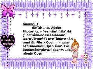 เปิดโปรแกรม Adobe Photoshop หลังจากนั้นให้เปิดไฟล์รูปภาพที่ต้องการจะตัดเลือกเอาเฉพาะบริเวณที่ต้องการ โดยการคลิ้กเมนูคำสั่ง File > Open… จะแสดงไดอะล็อกบ็อกซ์ Open ขึ้นมา จากนั้นคลิกเลือกรูปภาพที่ต้องการ แล้วคลิกปุ่ม Open