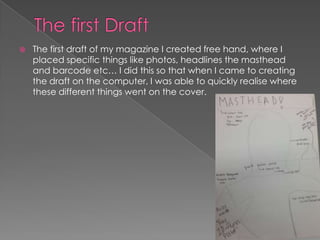 The document describes the process of creating a magazine cover in Photoshop. It discusses creating a first draft by hand then a second draft digitally. Images were edited to remove backgrounds. Text was added layer by layer. Feedback suggested making the black font bolder, changing the star color, adding a background color, and spacing elements out more. The creator then made these changes digitally to improve readability and eye-catching design.
