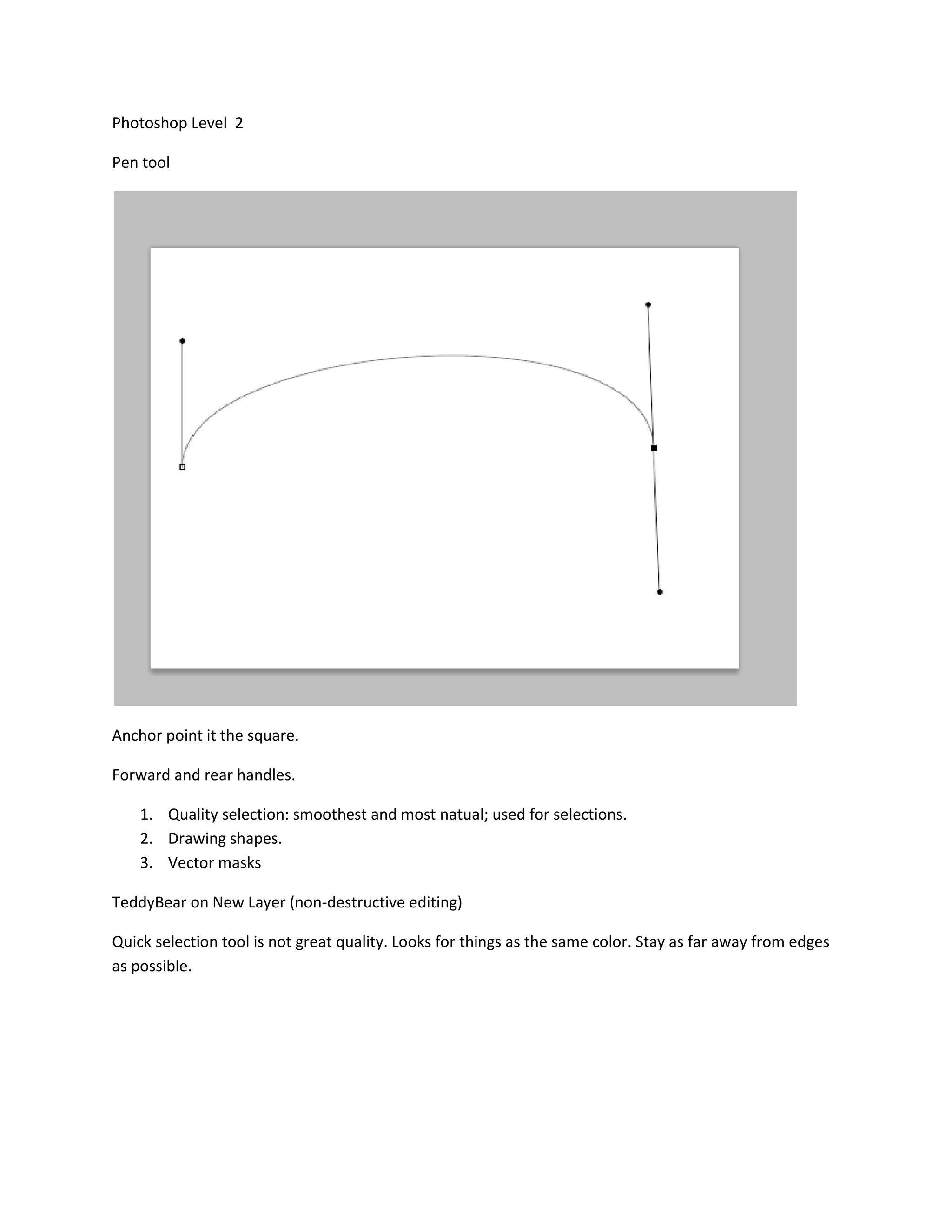 This document provides an overview of tools and techniques in Photoshop Level 2, including the pen tool, vector masks, quick selection tool, magic wand, keyboard shortcuts, brush tools, and making selections. Key points covered include using the pen tool to draw shapes and create vector masks, refining selections with the quick selection tool, inverting selections, and saving selections as alpha channels.