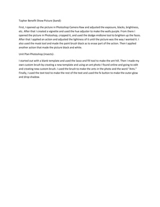 The first document describes editing a band photo in Photoshop by adjusting exposure, adding a vignette, changing hue, cropping, brightening faces, applying and adjusting an action, masking part of the action, and converting to black and white. The second document summarizes making an insect unit plan photo in Photoshop by using tools to create an ant hill, making a custom brush from an online ant photo, using the brush to add ants and text, and adding outer glow and drop shadow effects to the text.