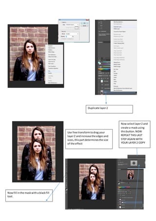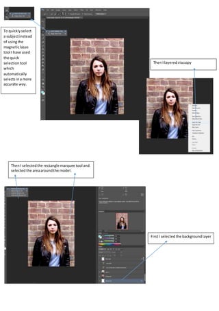 To quickly select a subject, the document recommends using the quick selection tool instead of the magnetic lasso tool for more accurate selections. It then provides steps to add a scattering effect around the selected subject by duplicating the selected layer, applying masks, and using the brush tool with specific scattering settings to paint around the inside and outside of the selected area. Adjusting the drop shadow blending options is also suggested to finish the effect.