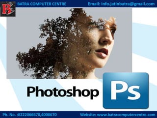The document provides an overview of Photoshop, a leading digital image editing application created by Adobe Systems in 1988. It outlines its features, advantages, and disadvantages, emphasizing its versatile tools for photo editing, custom graphics, and ease of use despite a learning curve. Additionally, it introduces Batra Computer Centre, which offers training in various software courses, including Photoshop.