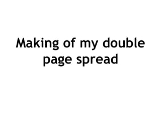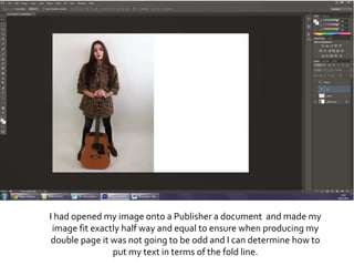 The document describes the steps taken to design a double page magazine spread. This included fitting an image across both pages, adding a masthead, page number, credits, pull quote, text boxes, and other design elements. Photoshop was used to edit images and Publisher was used to layout the text and images across the spread. The final outcome was a designed magazine page following conventions with additional elements like a tracklist and album cover added.