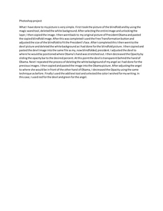 First, the background was removed from images of a blindfold, devil, and angel using the magic wand tool. These images were then copied and pasted into a photo of President Obama, adjusting their sizes and positions. The devil image was placed behind Obama's outstretched hand and made transparent. The angel image was placed in front of Obama's other hand and also made transparent. Finally, red and green text was added to identify the devil and angel images.