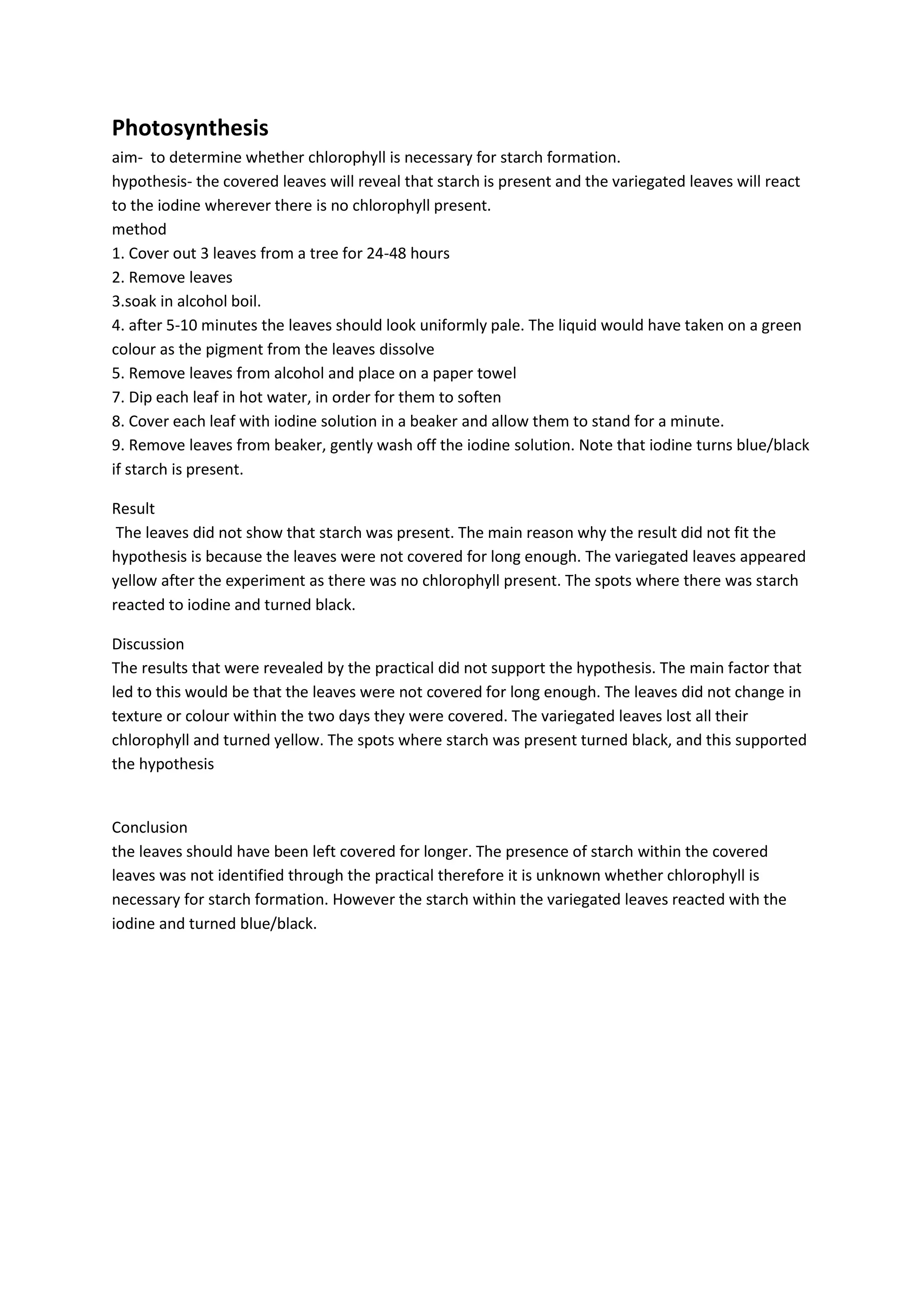 This document summarizes an experiment to determine if chlorophyll is necessary for starch formation in leaves. The hypothesis was that covered leaves would show starch presence and variegated leaves would react to iodine where chlorophyll was absent. Leaves were covered for 24-48 hours then tested with iodine. The results did not support the hypothesis as the covered leaves did not change, but variegated leaf spots without chlorophyll reacted and turned black, indicating starch. The conclusion was the experiment should have left leaves covered longer to better test the hypothesis.