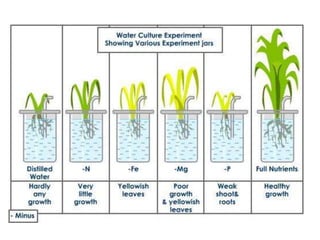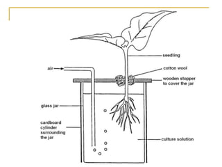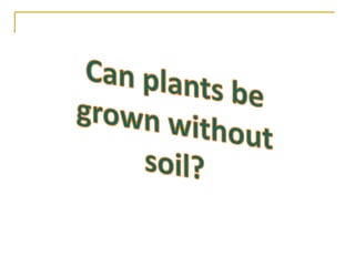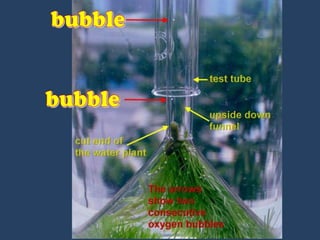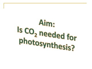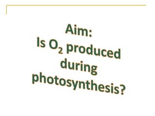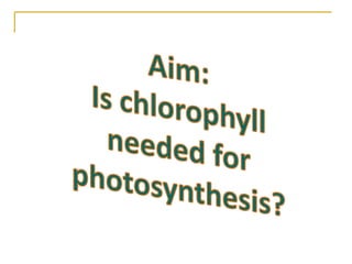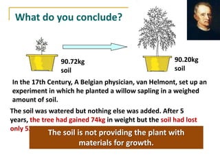 The document summarizes an experiment on photosynthesis. [1] Van Helmont planted a willow sapling and measured the soil weight before and after 5 years, finding only a small loss of 52g of soil. [2] However, the tree had gained 74kg, showing that the soil is not the main source of a plant's growth materials. [3] Photosynthesis converts carbon dioxide, water, and sunlight into glucose and oxygen using chlorophyll in the leaves.