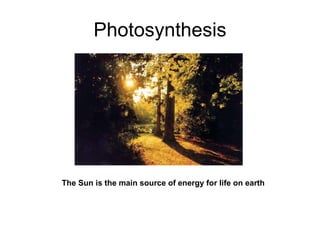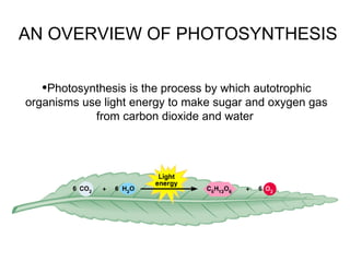 Photosynthesis is the process by which plants use sunlight, carbon dioxide, and water to produce oxygen and energy in the form of sugar. It occurs in two stages: the light-dependent reactions in the chloroplasts absorb sunlight and split water, producing oxygen and energized molecules. The Calvin cycle then uses this energy to fix carbon from carbon dioxide into organic compounds like glucose. Chlorophyll and other pigments capture sunlight and transfer the energy through electron transport chains to produce ATP and NADPH, which power the Calvin cycle to reduce carbon dioxide into sugars.