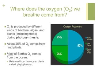 - Autotrophs like plants use photosynthesis to produce their own food, and release oxygen into the atmosphere as a byproduct. Most of Earth's oxygen comes from phytoplankton in the ocean.