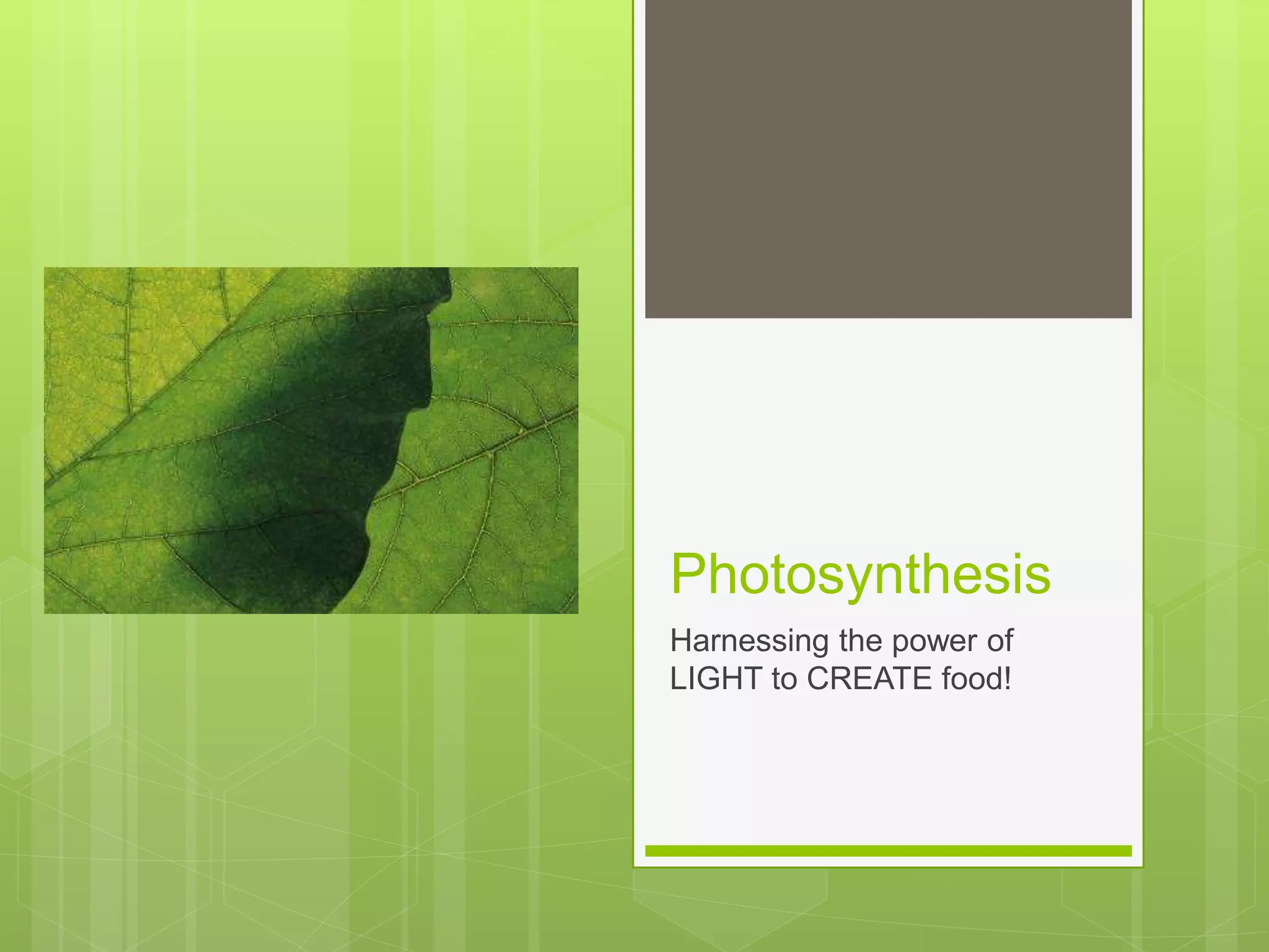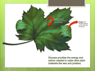 The document provides information about the process of photosynthesis. It explains that photosynthesis takes place in the chloroplasts of plant cells, where chlorophyll absorbs light energy and uses it to convert carbon dioxide and water into glucose and oxygen. The process involves two stages - the light-dependent reaction that uses light to produce ATP and NADPH, and the light-independent Calvin cycle that uses the ATP and NADPH to fix carbon dioxide and produce glucose. Plants appear green because chlorophyll, the pigment that absorbs light for photosynthesis, reflects green light wavelengths.