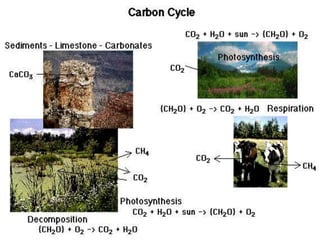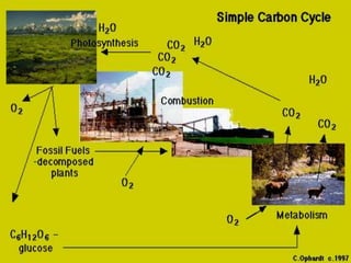 Photosynthesis is a key part of the carbon cycle. It involves producers converting inorganic carbon dioxide into organic compounds like glucose. Primary consumers obtain these organic compounds by eating producers, and secondary consumers obtain carbon by eating primary consumers. Cellular respiration by all organisms returns carbon dioxide to the atmosphere. Humans have disrupted this natural cycle by extracting and burning fossil fuels, releasing carbon that has been locked away for thousands of years back into the atmosphere as carbon dioxide, contributing to increased global warming.