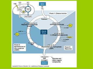 Photosynthesis converts sunlight into chemical energy through a series of light-dependent and light-independent reactions. The light reactions use energy from sunlight to produce ATP and NADPH, which provide energy and electrons to drive the Calvin cycle. The Calvin cycle fixes carbon from carbon dioxide into organic three-carbon sugars like glyceraldehyde-3-phosphate, using the ATP and NADPH produced in the light reactions. One sugar molecule is used for growth, while five are recycled to regenerate the starter molecule for the next round of the Calvin cycle.