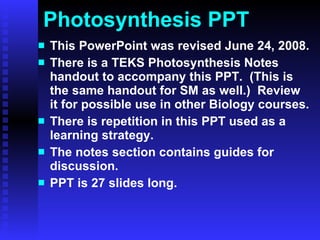 This PowerPoint presentation covers photosynthesis and was last revised in June 2008. It contains 27 slides discussing topics like the light and dark reactions of photosynthesis, chloroplast structure, and how plants use light energy from the sun to produce glucose and oxygen from water and carbon dioxide. The document provides an overview of photosynthesis and its key stages and equations.
