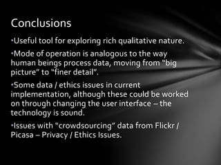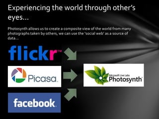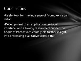 Photosynth allows researchers to capture rich visual data by combining multiple photographs into an interactive 3D scene. This technique can be used to document spaces, objects, and events in greater qualitative detail than individual photos or video. Photosynth also allows researchers to experience and analyze the spatial relationships between different photographic perspectives in a way that helps make sense of complex visual data and scenes. However, the current implementation of Photosynth has some limitations regarding data handling, privacy, and ethics that researchers would need to consider.